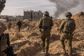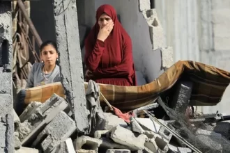 A woman sits amid the rubble at the Fahmi Al-Jarjawi school in Gaza City, on…